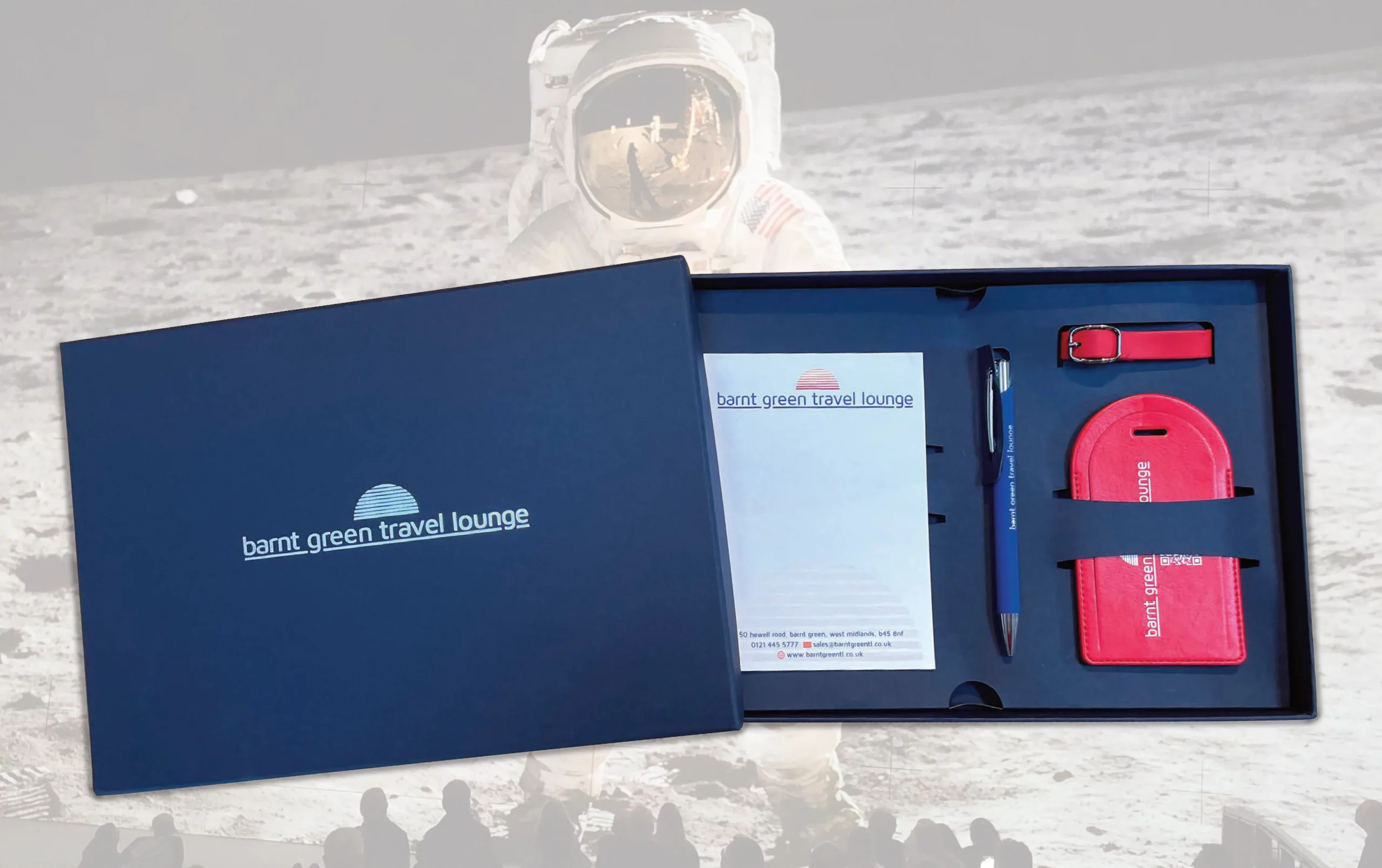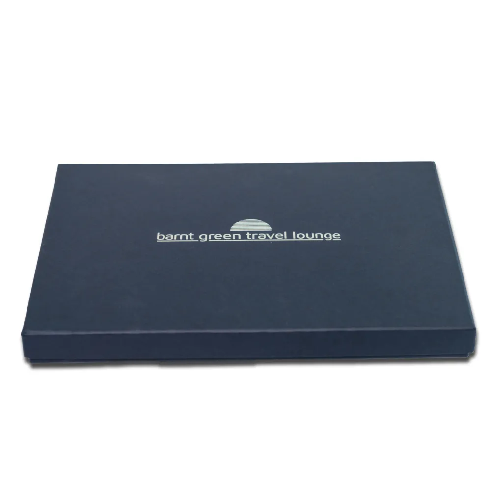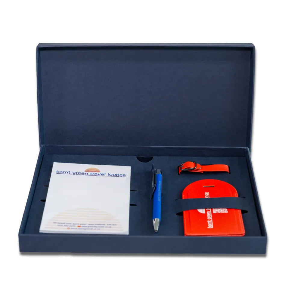 A stunning imperial blue, paper overboard document box and lid. With a foil block corporate logo on the outside. Stocked with useful branded items for the high-end traveller. A6 scribble pad for jotting down useful notes, a laser-engraved metal ball-point pen and red Belluno leather luggage tag and fastener. Printed with logo and QR code for quick access to the Barnt Green Travel Lounge website. Below the tray, there is ample space to place important travel documentation.