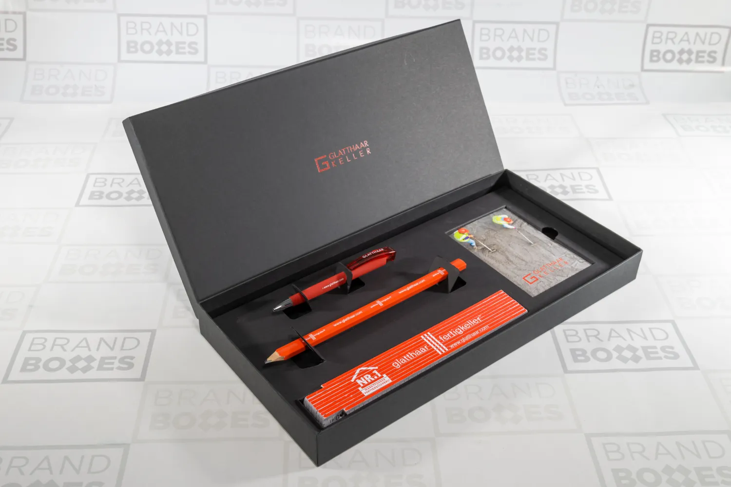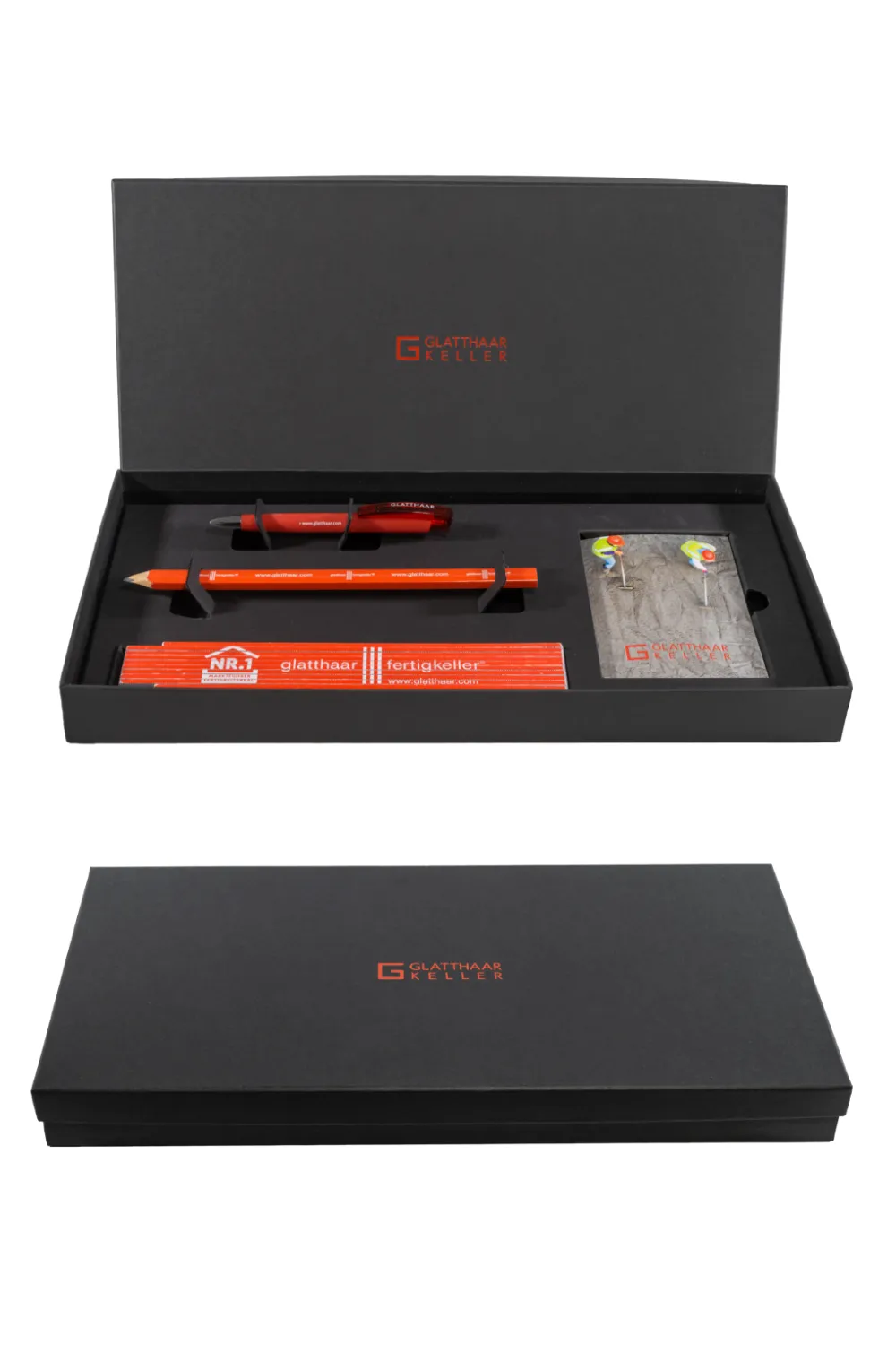 Balancing the rugged, industrial aesthetic of the construction industry with the elegance expected of a corporate gift. Ensuring each component—pen, pencil, ruler, and notepad—reflected quality while aligning with Glatthaar’s brand image.