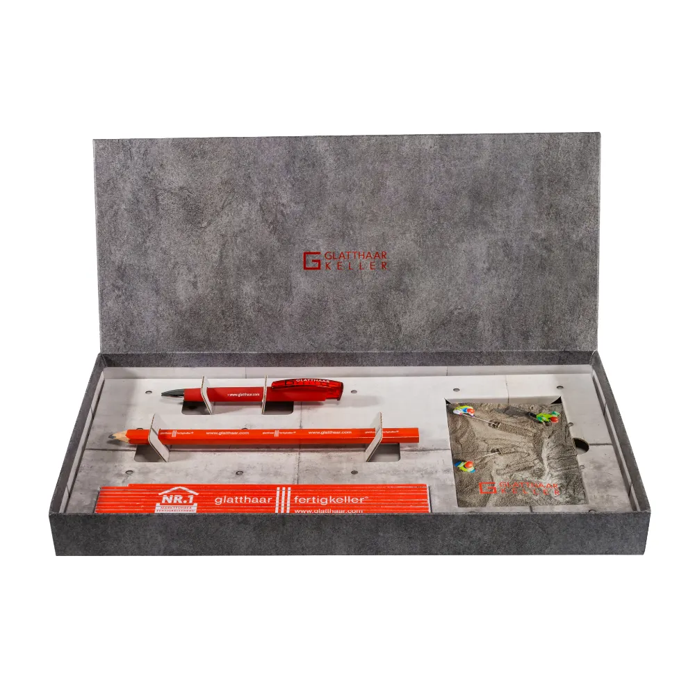 The finished presentation box successfully married form and function, providing Glatthaar Keller clients with a practical yet memorable gift. It reinforced Glatthaar Keller’s premium brand identity and showcased their concrete solutions through the engaging printed illustrations.