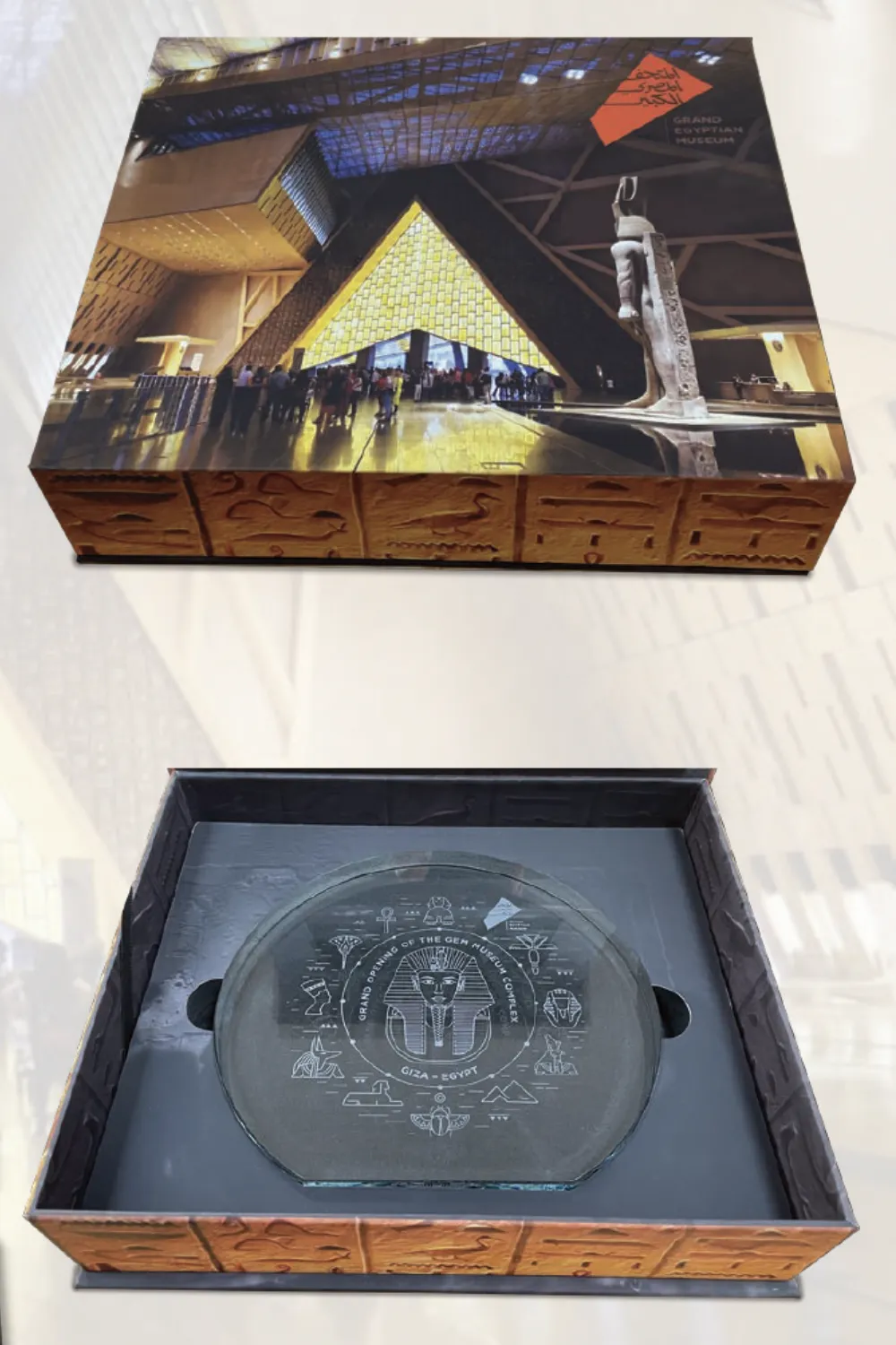 This next-gen Brand Box delivers an immersive, tech-driven invitation experience. Upon opening, a video featuring an AI-generated avatar auto-plays, warmly inviting the recipient to the Grand Opening of the GEM Museum in Giza on 3rd July 2025. The avatar highlights key artifacts on display, and concludes by prompting the viewer to scan a QR code. This links to the Panivox platform, offering a replay of the invitation and live interaction with the avatar for event-related queries. A beautifully engraved glass memento, housed in the box’s base, serves as a lasting keepsake from this unique, memorable engagement.