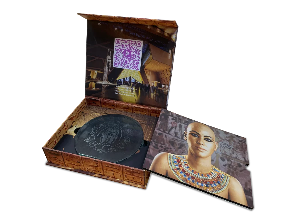 A unique collaboration between Panivox, industry leaders in AI avatar voice technology, and Brand Boxes, specialists in bespoke presentation. To create an innovative and unforgettable VIP invitation experience that would capture the grandeur and cultural importance of the Grand Opening of the GEM Museum in Giza, Egypt. The goal was to merge cutting-edge digital storytelling with high-end physical craftsmanship, delivering an invitation that would not only inform, but also inspire, leaving a lasting impression on each recipient.