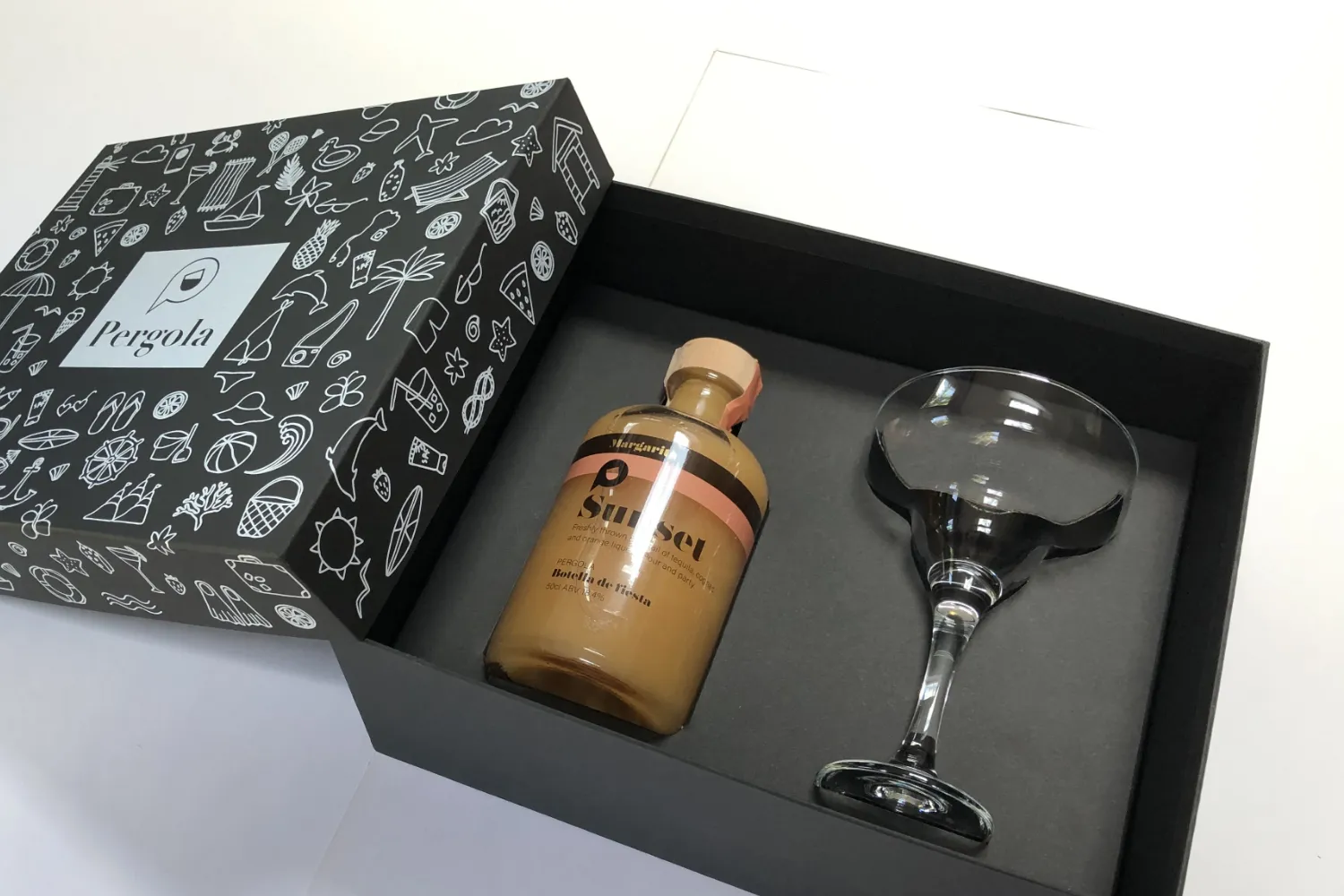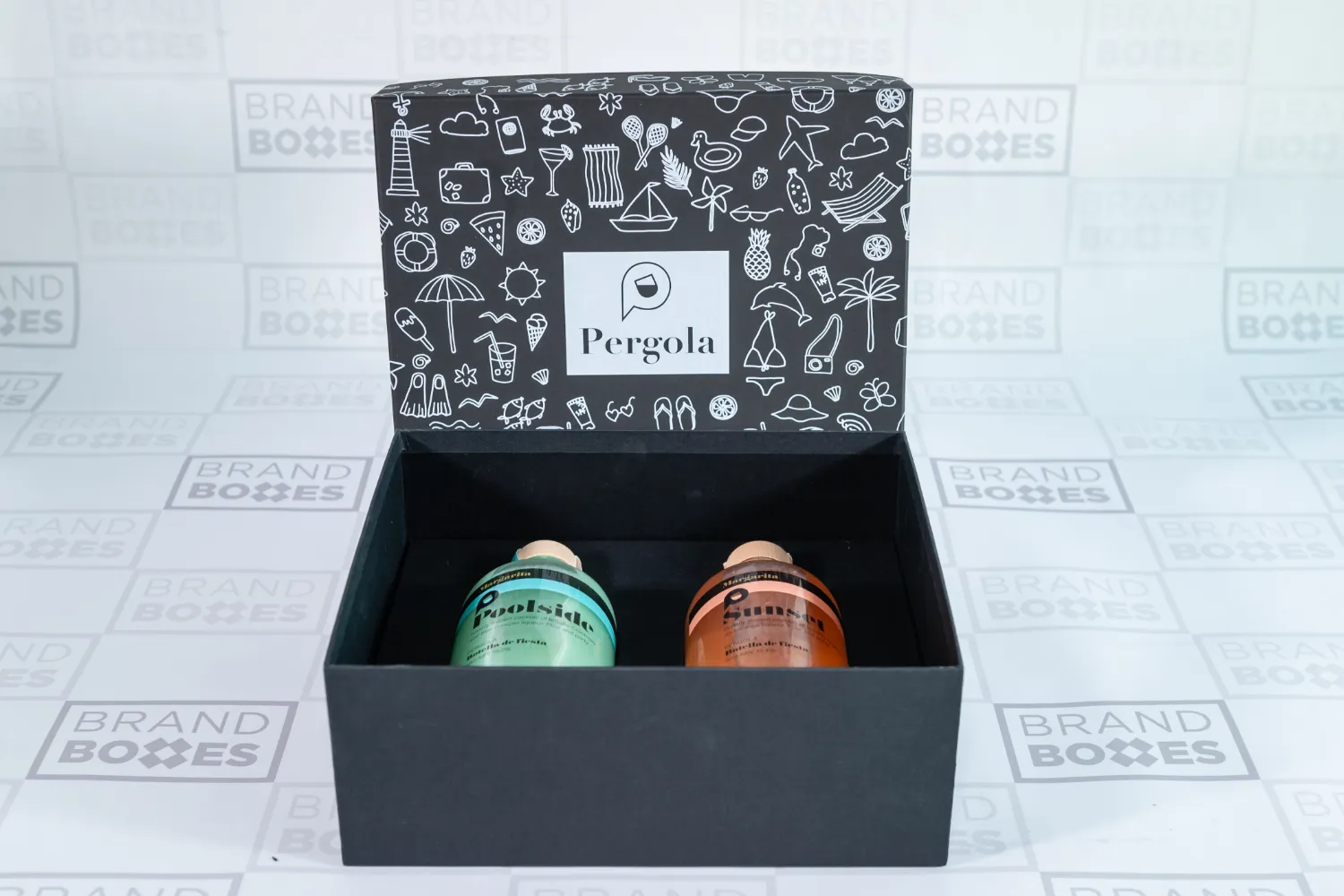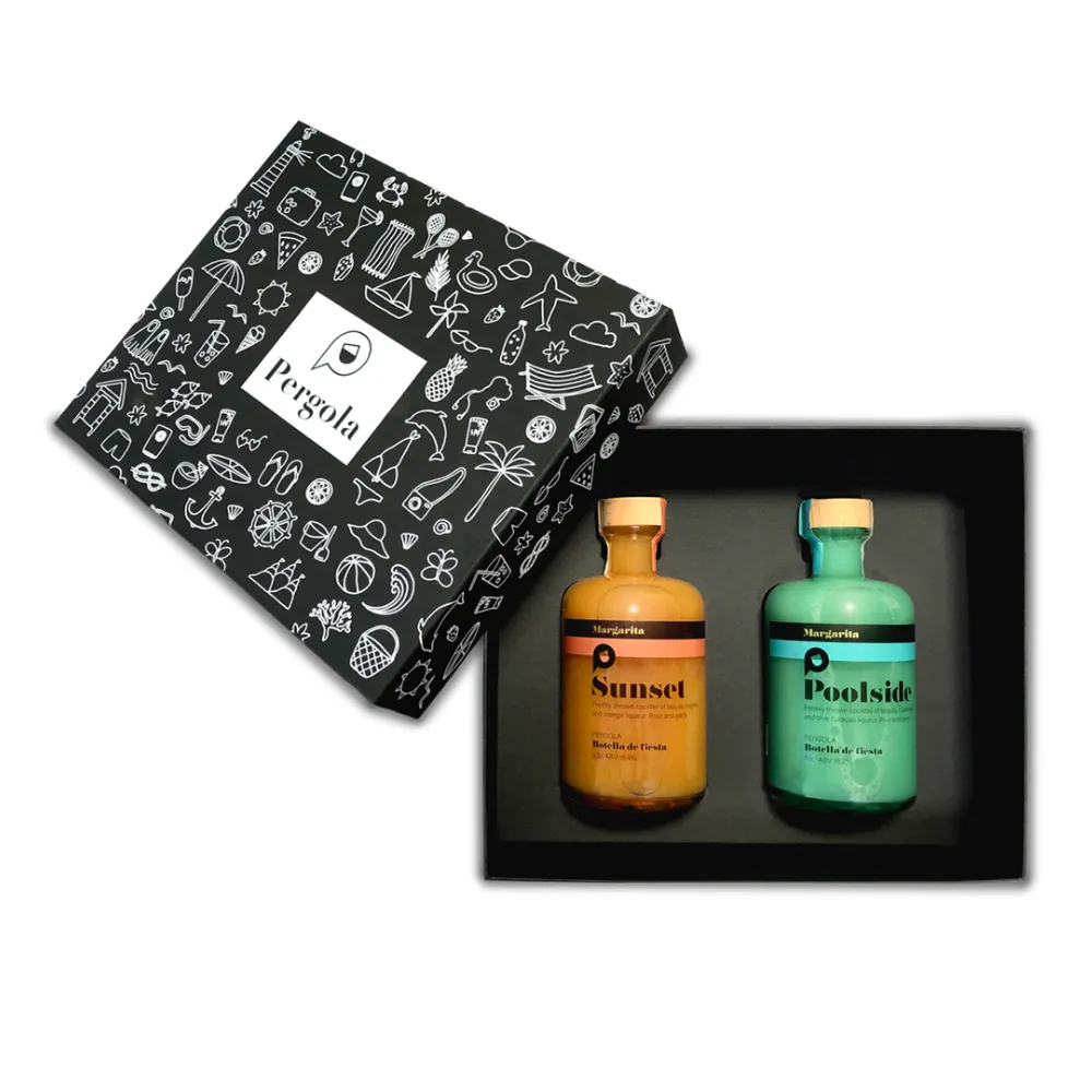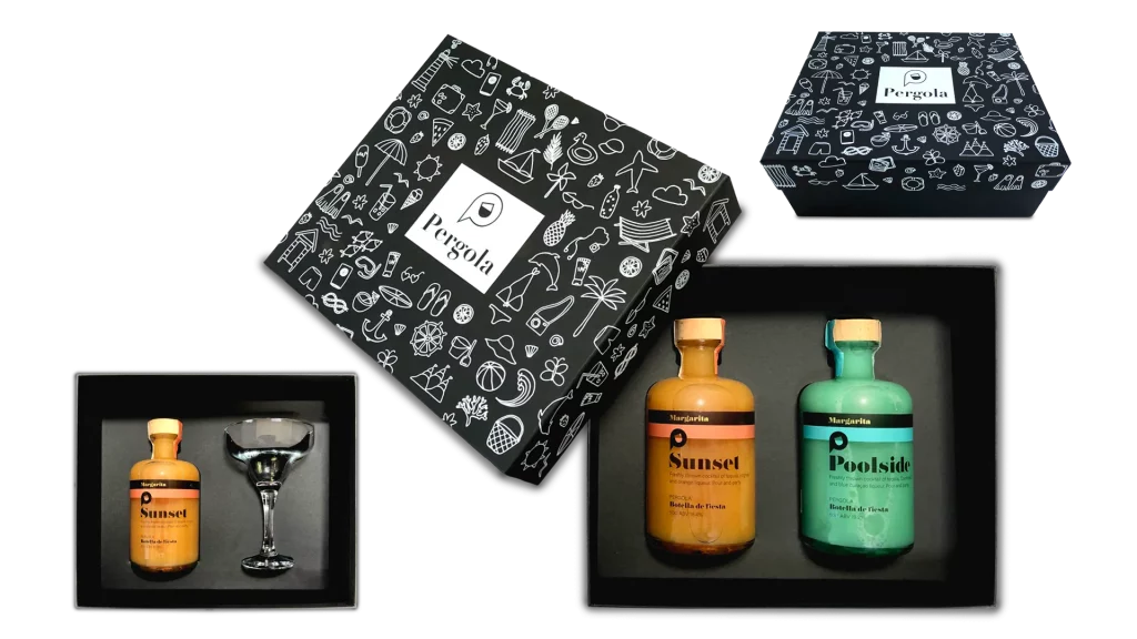 To design a visually striking presentation box that would introduce the Pergola Drinks brand to the market with flair. The box needed to house two signature drink bottles securely while reflecting the playful and vibrant essence of the brand’s identity.
