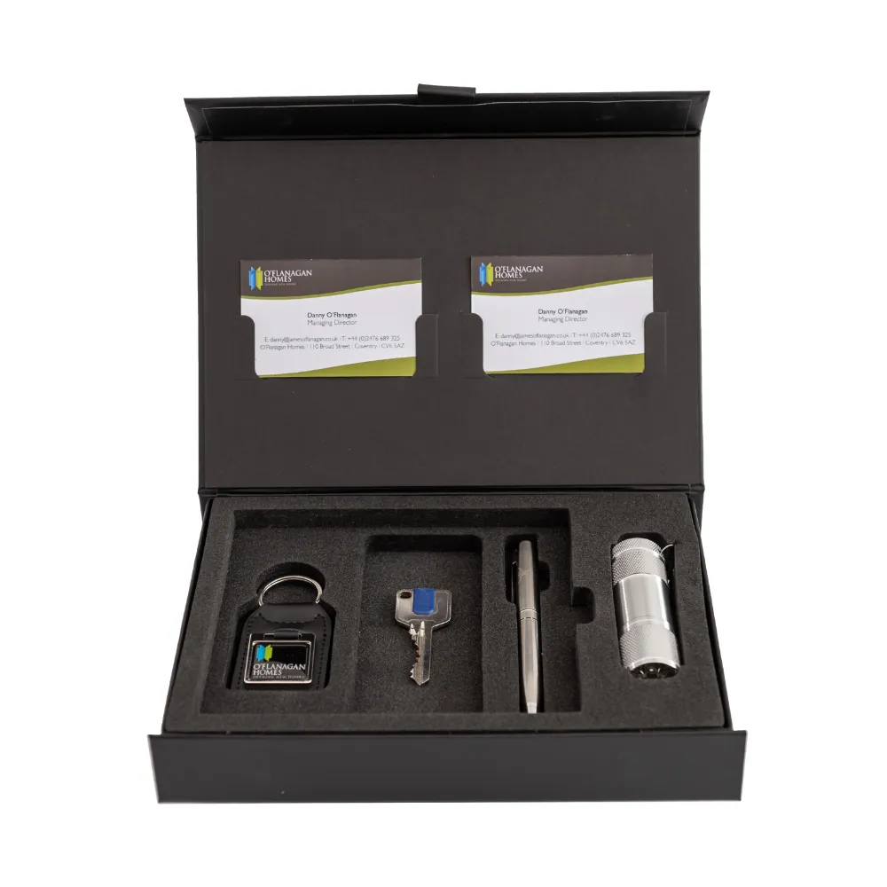 20 off design of black textured matt laminated box with colour decal. Containing branded: Stainless Steel Ballpen, LED torch, Leather Key Fob with Full Colour Decal Medallion and Perfect Bound Pad with Full Colour Wraparound Cover. Allow £64.00 per box
