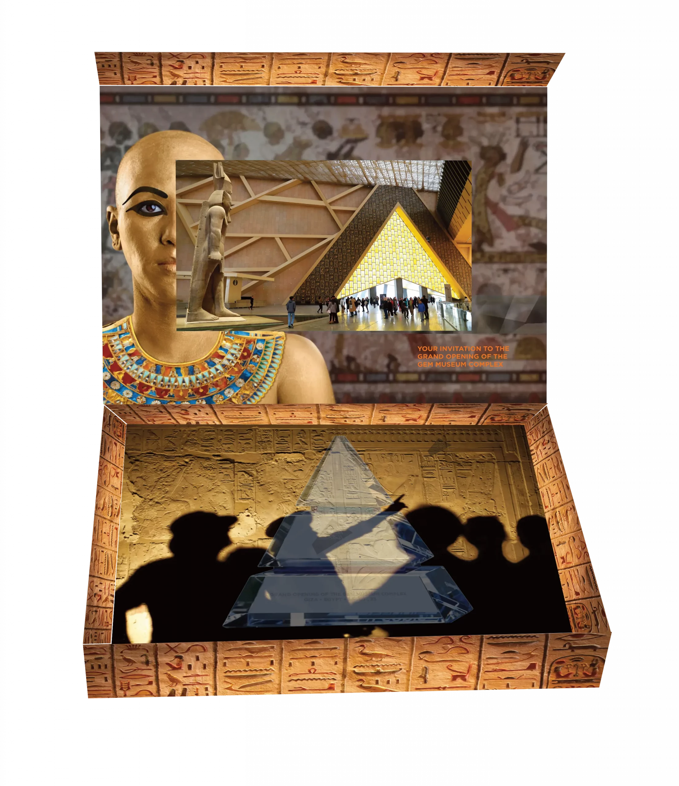 A luxury full colour printed, soft touch laminated AI Avatar Video Presentation Box, commissioned for the Grand Opening of the GEM Museum – ‘Gateway To The Pyramids at Giza, Egypt’. The box is built with a 7” high-definition screen, with auto start when you open the lid. The video contains an AI Avatar who introduces and invites the invitee (world leader) to the Grand Opening Event. At the end of the video, a QR Code is displayed and the invitee is encouraged to scan it with their mobile phone. The link takes them to a platform where they can watch the invitation information again and/or ask the host avatar any questions they might have about the event. The engraved glass memento nestled in the base of the box was intended for the guest to keep as a reminder of their wonderful experience at the GEM Museum in Giza, Egypt.