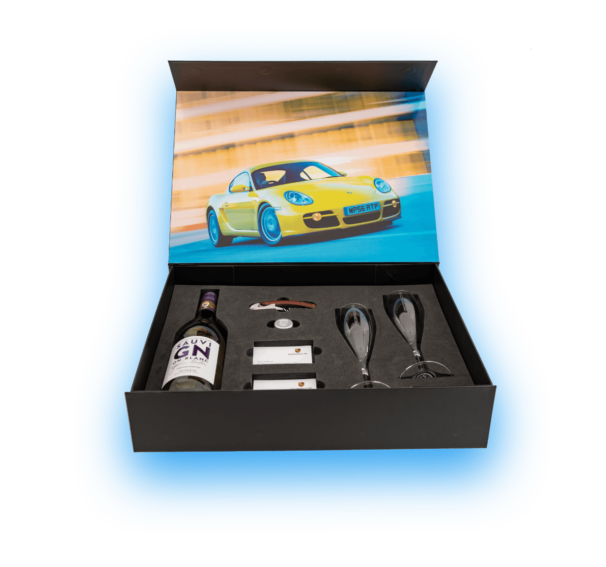Designed to wow the winner of an event with a new Porsche car by handing over the keys in a superbly crafted and equally prestigious presentation box. Illustrating an action shot of the prize as well as an outstanding bottle of wine. Gifting the recipient with the opportunity to celebrate the occasion with a significant other. A luxury paper overboard box with matt laminate over the whole of the outside of the box. Coloured Spot UV printed logo. Magnetic front flap closure. Gloss photograph of Yellow Porsche on inside lid. Branded items are set in high-density laser-cut foam for a plush, snug fit. The box contains two business cards with a recess below to place keys, a bottle of wine (choose between high/low price points), two engraved glasses, a wooden handled corkscrew and a handmade branded metal bottle stopper.